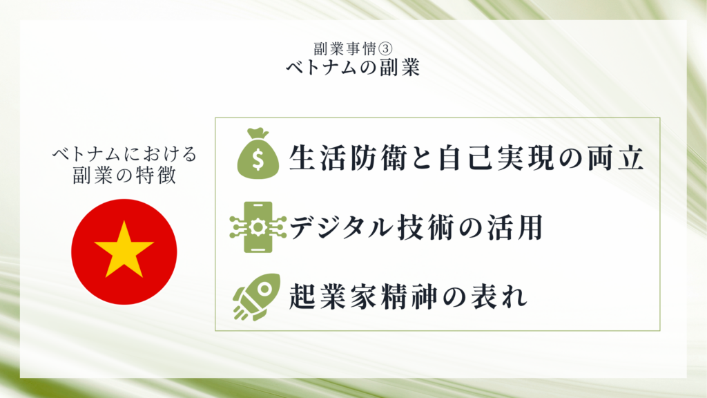ベトナムにおける副業の特徴は以下の通りです。