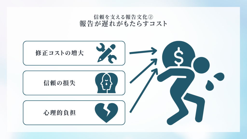 - 信頼の損失:報告が遅れたことで「隠された」と誤解され、チーム全体の信用が低下。
