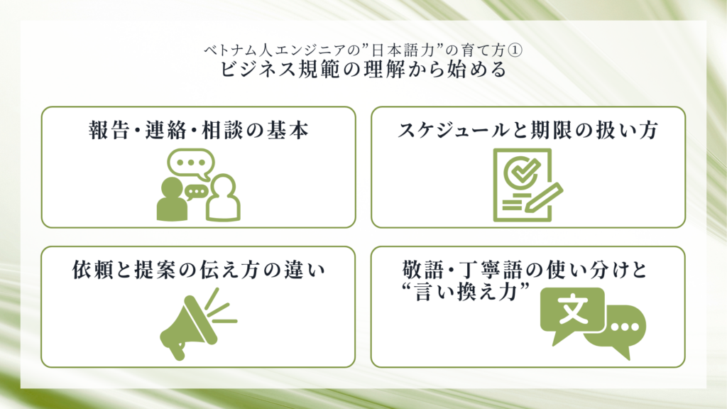 特にオフショア開発では、言葉の使い方がそのまま信頼の印象につながるため、ソフトスキル教育を日本語教育と並行して行うことが理想です。