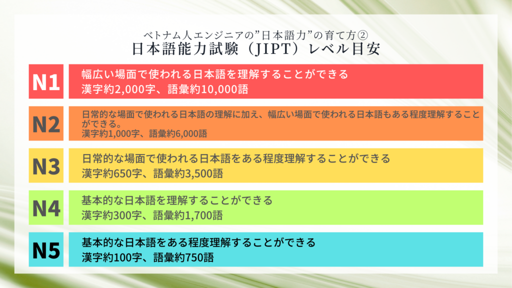 多くのベトナム人エンジニアは、文法・語彙・読解といった学習でN2に到達します。